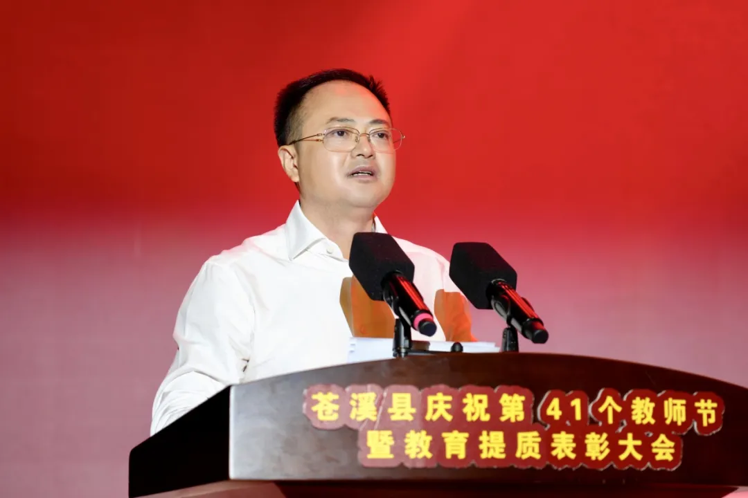 张世忠在会上代表县四套班子,向全县广大教师、教育工作者和离退休老教师,致以节日问候和美好祝愿!向受到表扬的集体和个人,表示热烈的祝贺!向长期以来关心支持苍溪教育发展的社会各界人士,表示衷心的感谢!他指出,近年来,苍溪县委县政府坚定实施教育优先发展战略,锚定“教育强县建设”目标,以人民满意为标准,以高质量发展为主线,以立德树人为根本,上下齐心、真抓实干,使全县教育环境不断优化、教育公平不断彰显、教师队伍不断增强、教育质量不断提升,推动教育事业实现新跨越、迈上新台阶。