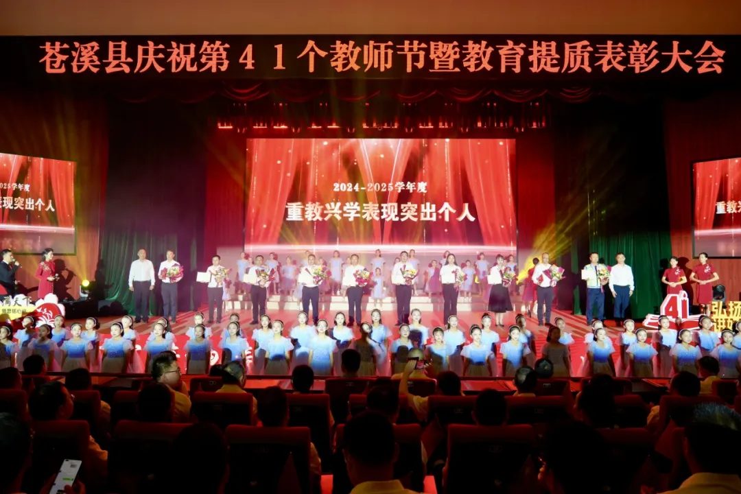 表彰大会上,张世忠、李汀、谢龙飞、赵丹、梁赛等县领导分别为教育质量表现突出集体,优秀班主任、优秀教师代表,第三届苍溪好老师代表,重教兴学表现突出集体代表、重教兴学表现突出个人代表颁奖。